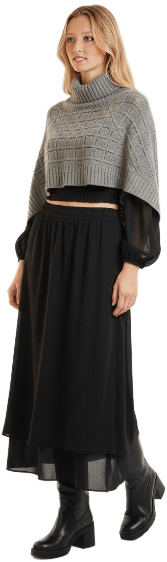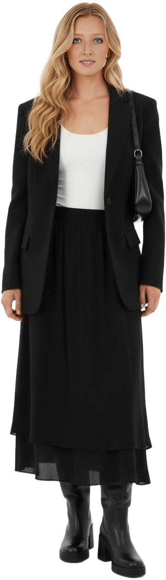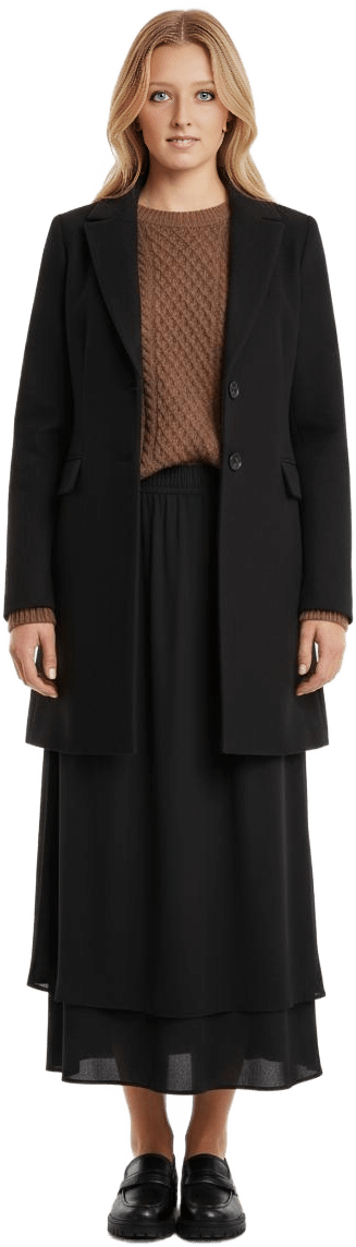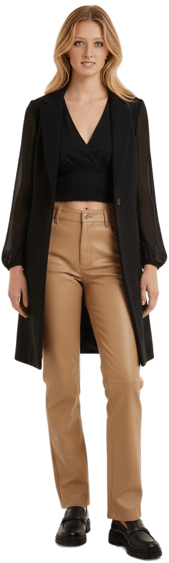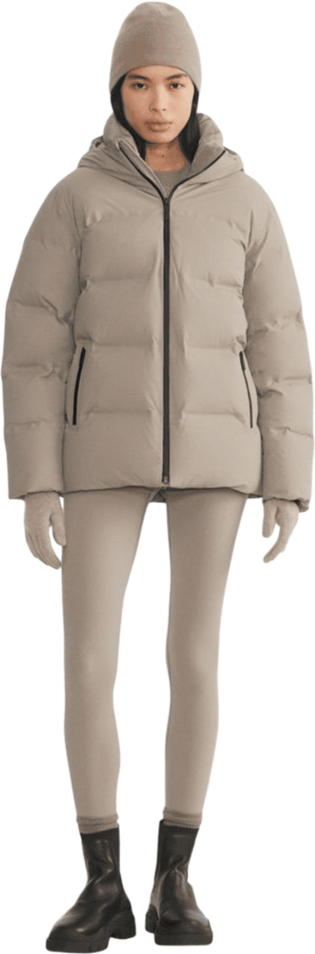 Make me a dressy outfit for cold weather with my black Melina pants and my taupe superpuff - Taupe Tones