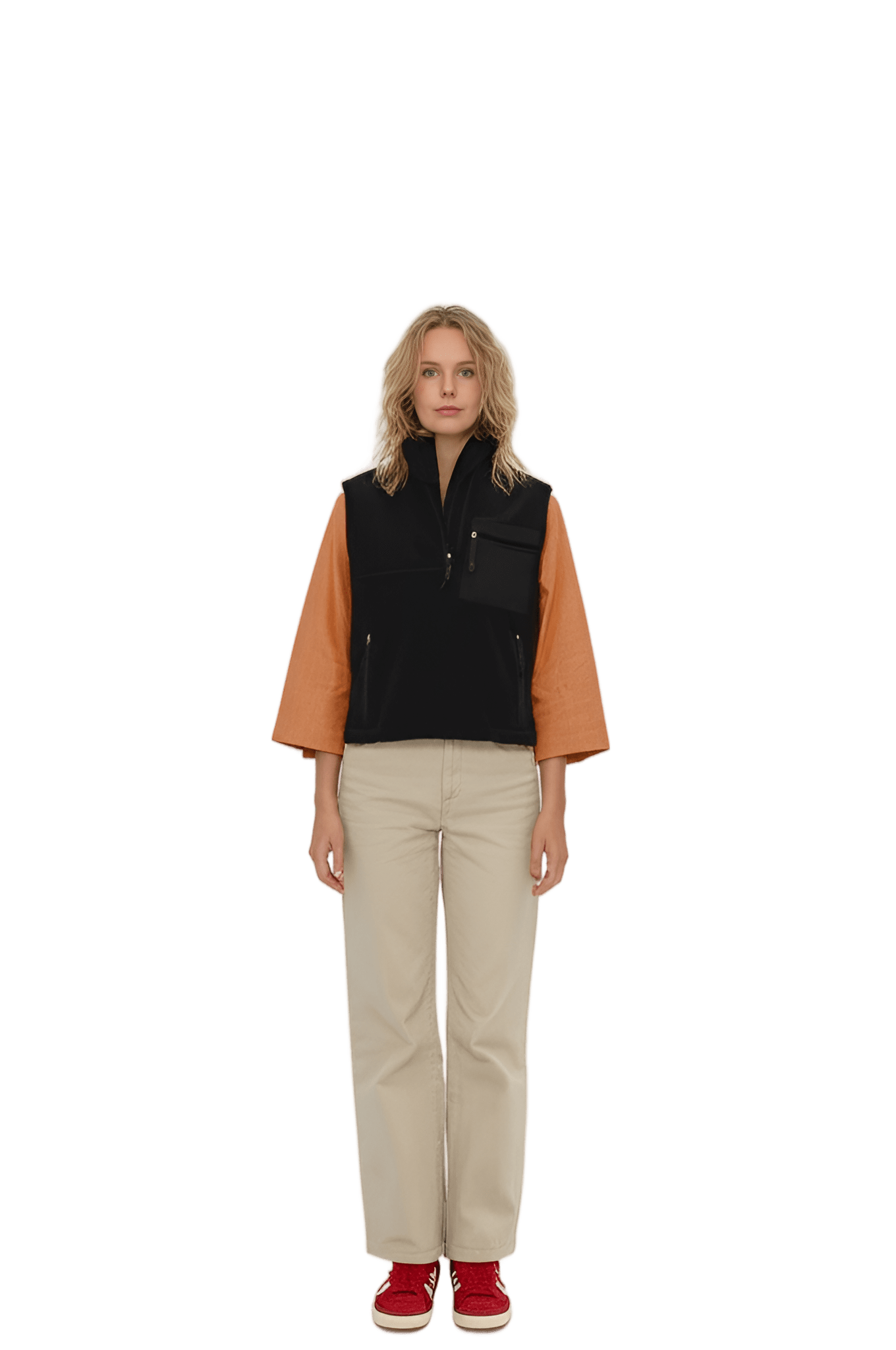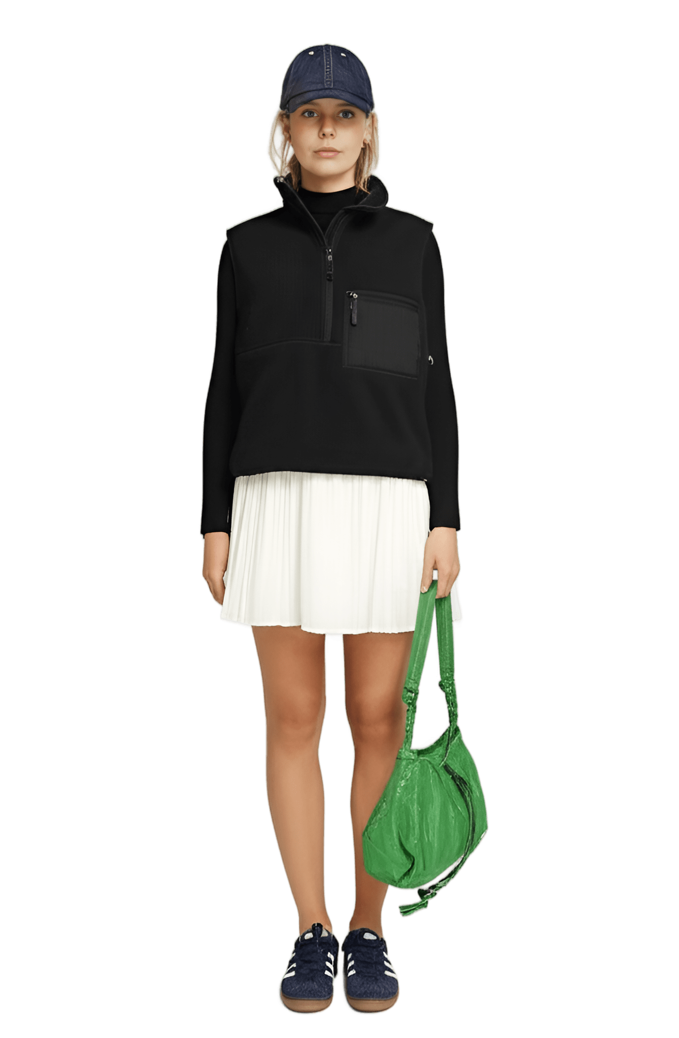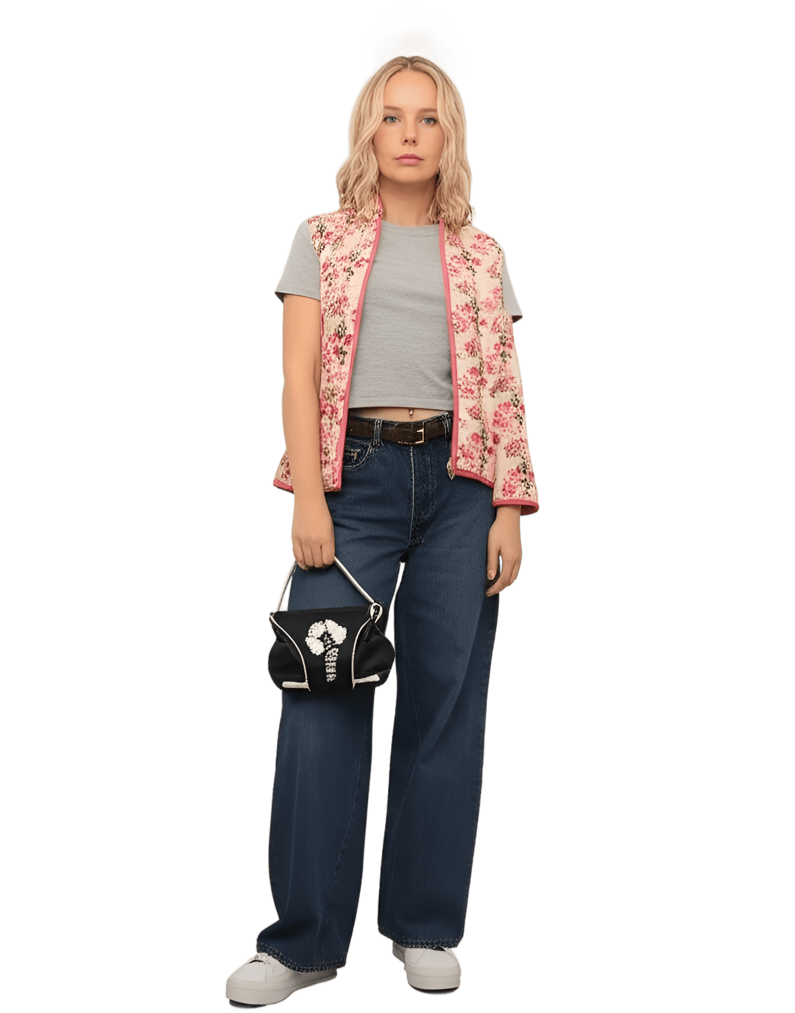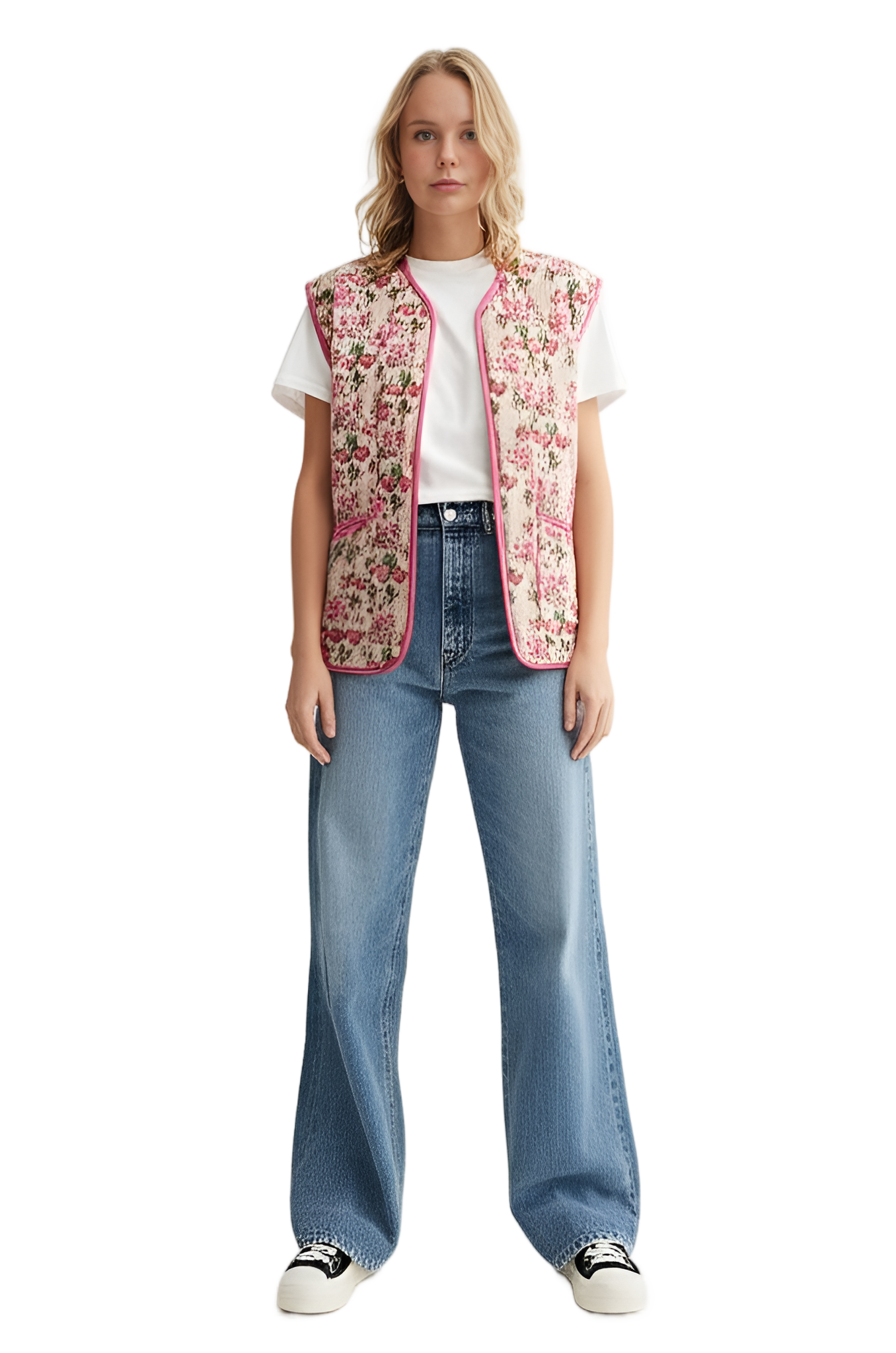 Sån här stil I want like the picture But i have a flower vest: white short-sleeved t-shirt pink fleece oversized vest black cotton cargo trousers - Park Picnic