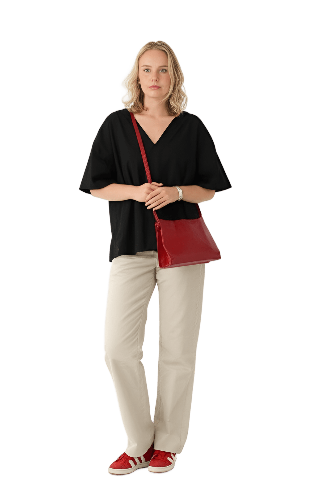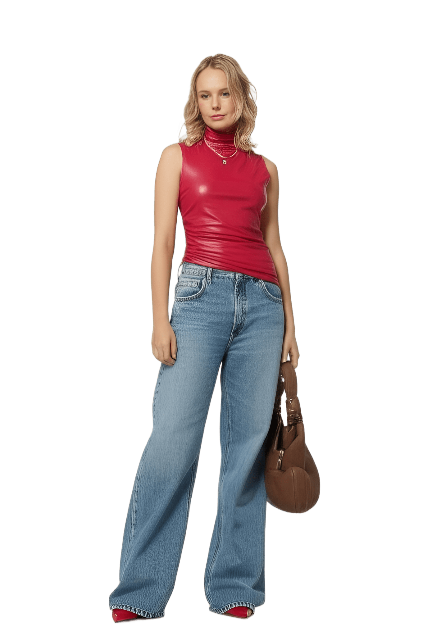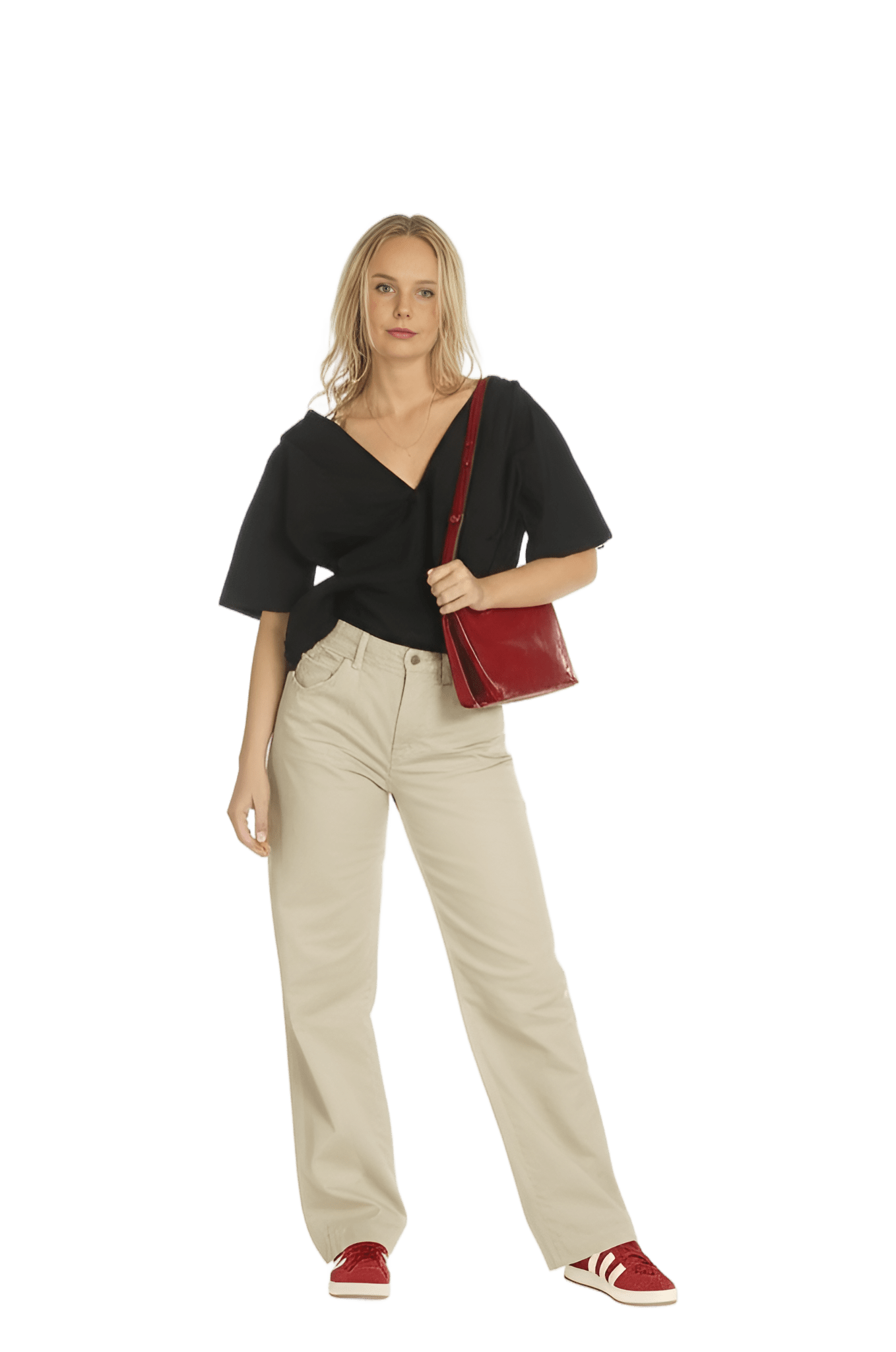This vibe: red leather oversized blazer white collared blouse beige wide-leg trousers red open-toe sandals - Urban Explorer
