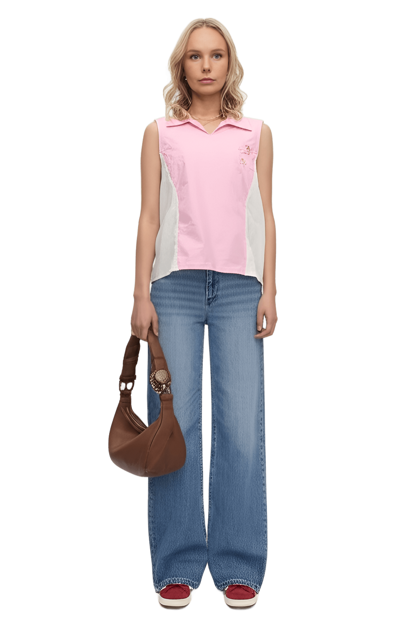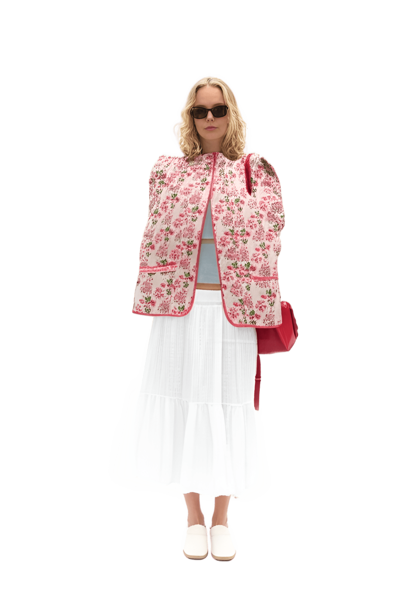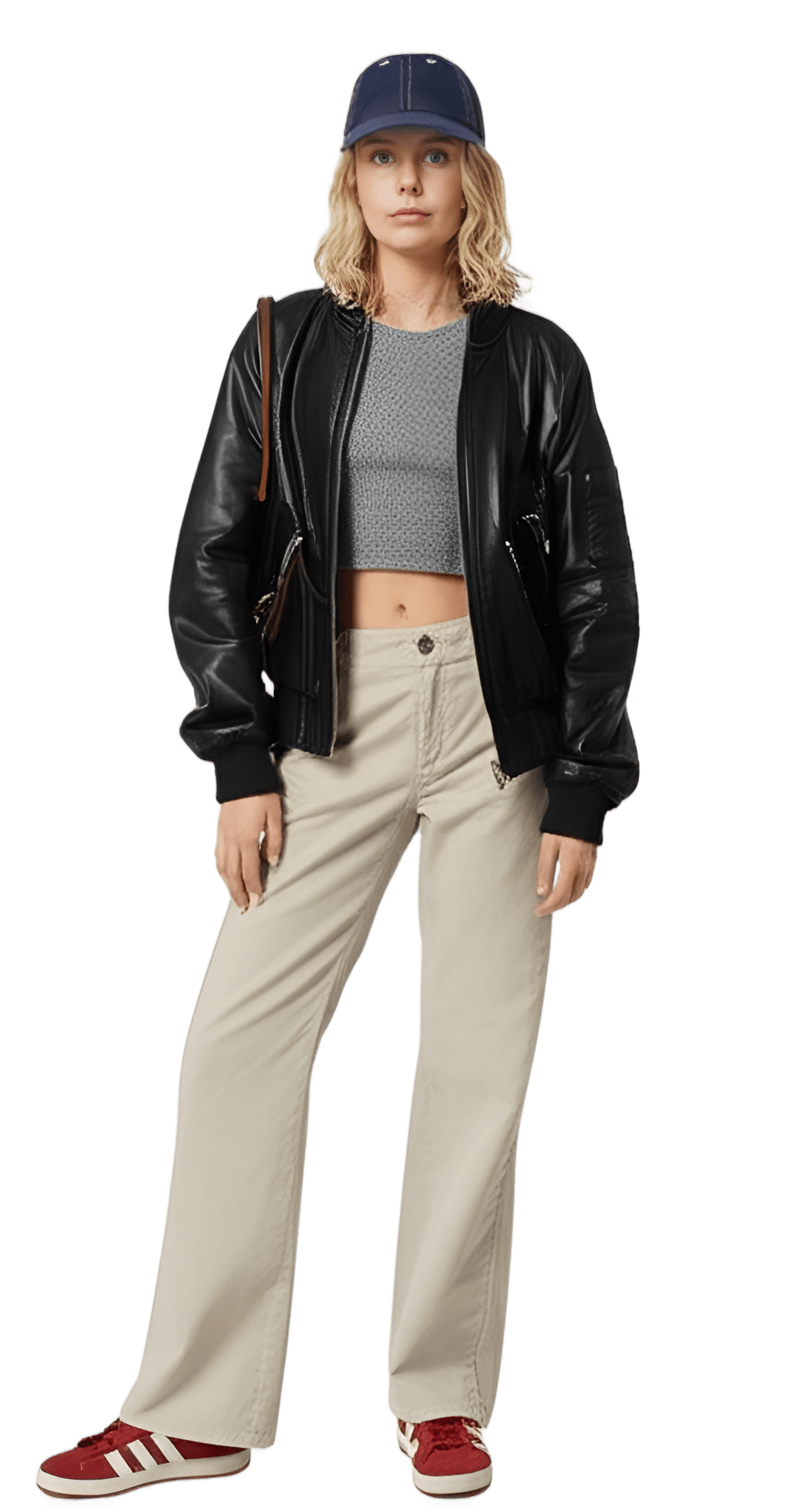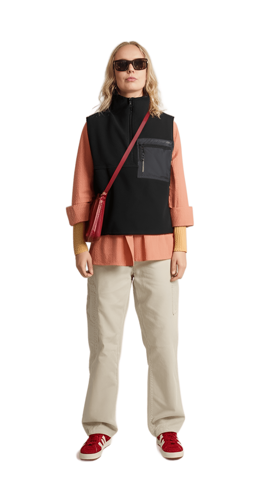 This vibe: red leather oversized blazer white collared blouse beige wide-leg trousers red open-toe sandals - Urban Explorer