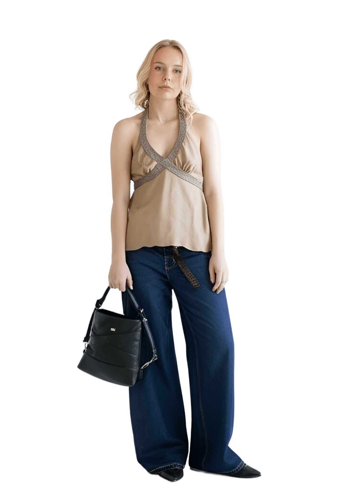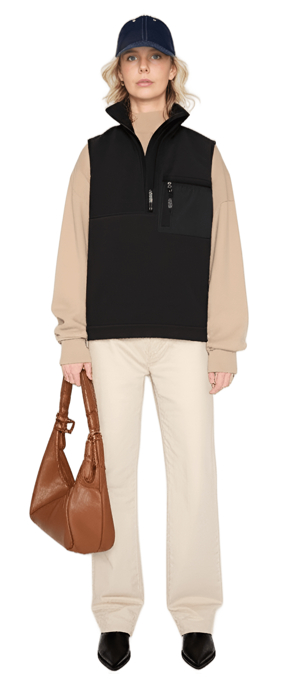 This outfit As much Alike this outfit as possible: white long sleeve top black sleeveless vest blue distressed wide-leg jeans brown slip-on shoes - Campus Cool