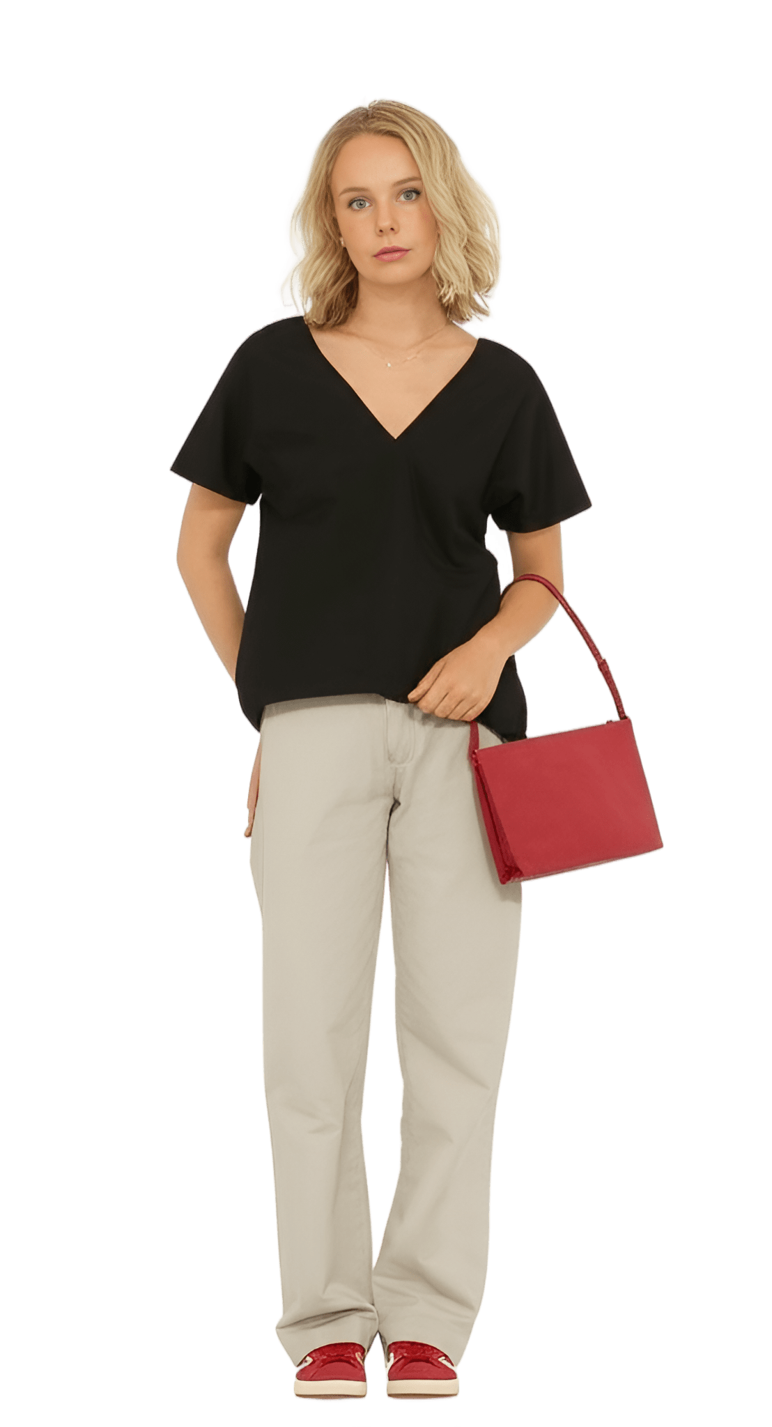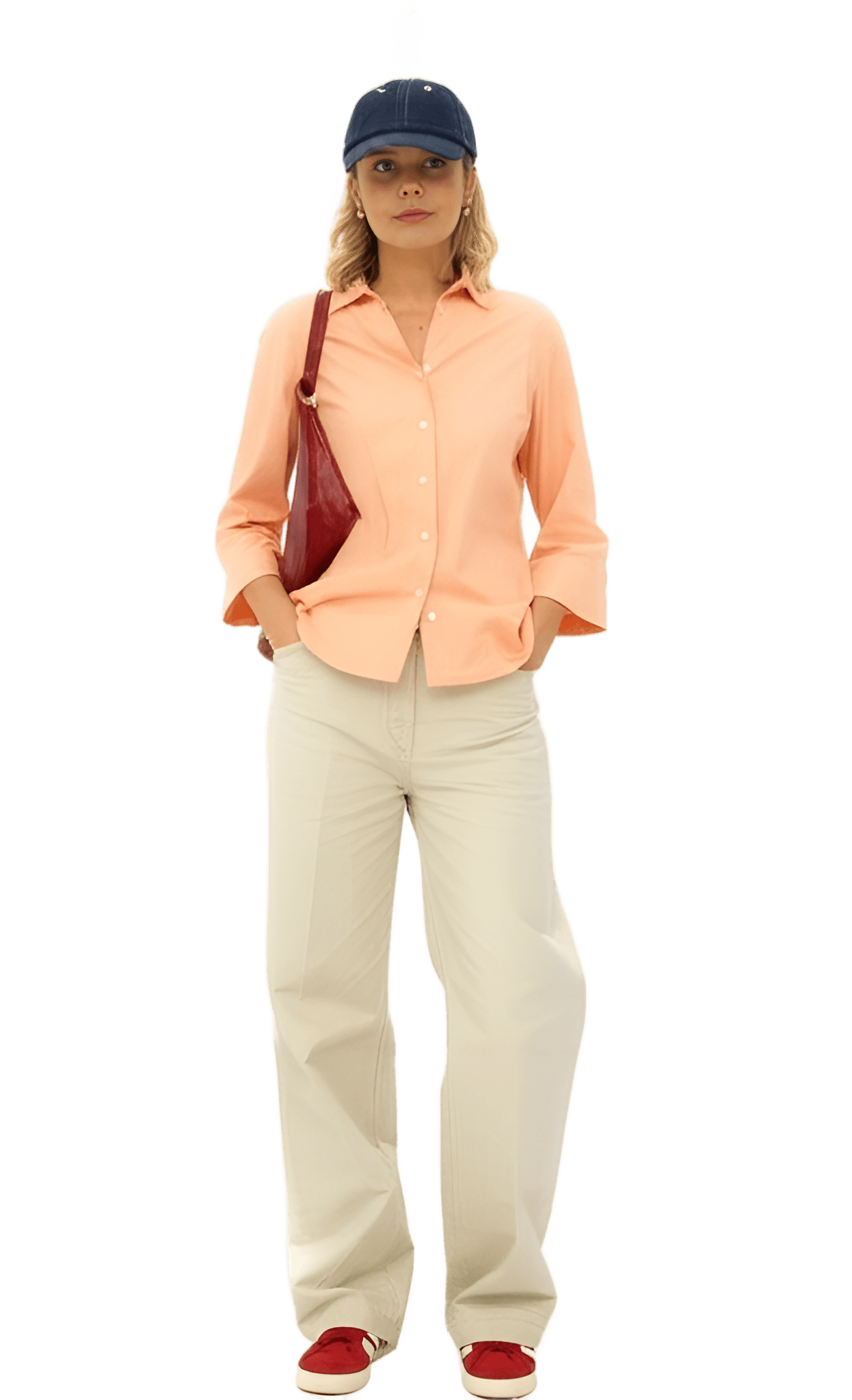 This vibe: red leather oversized blazer white collared blouse beige wide-leg trousers red open-toe sandals - Parisian Afternoon
