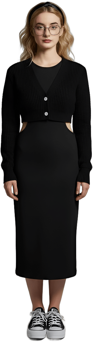 Black dress with white cardigan