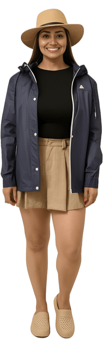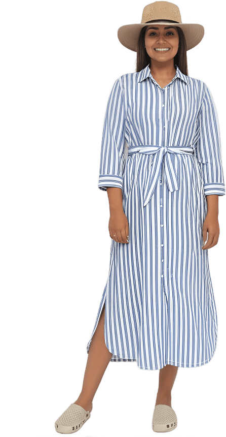 Blue striped dress, waterproof shoes
